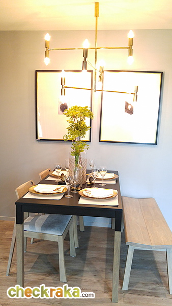 โต๊ะทานข้าวห้องนี้ใหญ่ขึ้นกว่าห้องที่แล้ว มีด้วยกัน 4 ที่นั่ง ได้วัสดุ และสีตามแบบนี้ เก้าอี้ตัวยาวเป็นไม้ดูแข็งแรงดีทีเดียว