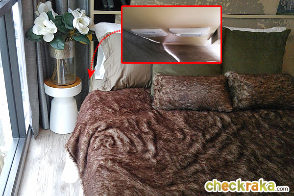 มีปลั๊กไฟที่หัวเตียงมาให้ด้วย ส่วนโต๊ะข้างเตียงเป็นเพียงของตกแต่ง
