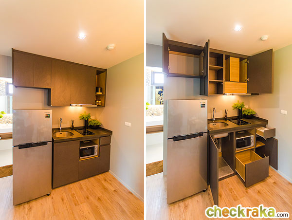 เคาน์เตอร์ครัวขนาดพอกันกับห้องที่แล้ว ตู้เก็บของได้ทั้งหมดตามนี้ หน้าบานปิดผิวด้วยลามิเนต