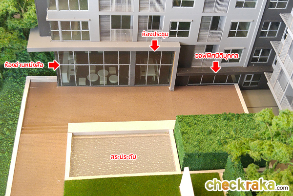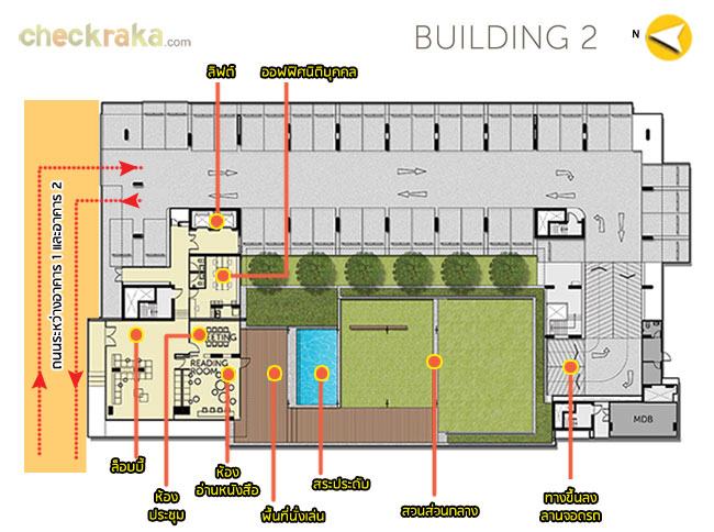 อาคาร 2 (ชั้น 1) : จะมี Lobby, ห้องอ่านหนังสือ, ห้องประชุม สวนพักผ่อนพร้อมลู่วิ่งจ๊อกกิ้ง และที่จอดรถด้านหลังอาคาร