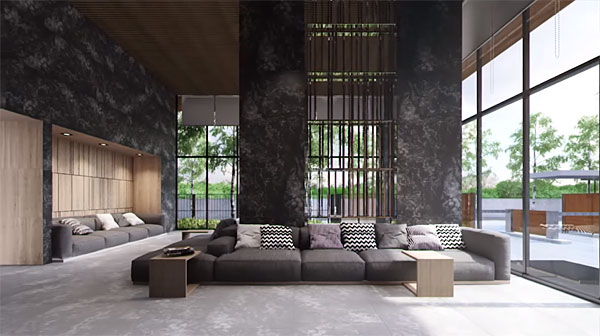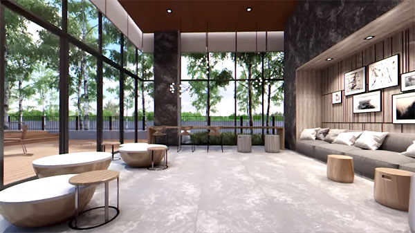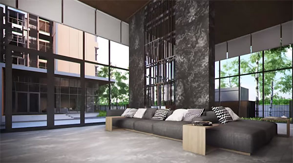 ล็อบบี้ของอาคาร 1 แบบ Double Volume ตกแต่งด้วยกระจกบานใหญ่ ให้ความรู้สึกโปร่งสบาย