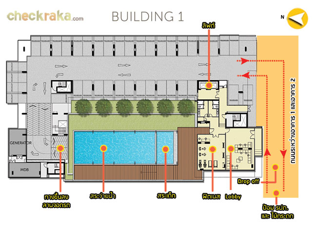 อาคาร 1 (ชั้น 1) : จะมี Lobby, ห้องฟิตเนส, สระว่ายน้ำ และพื้นที่จอดรถบริเวณใต้อาคาร และด้านหลังของอาคาร