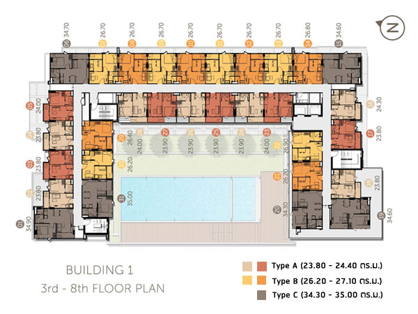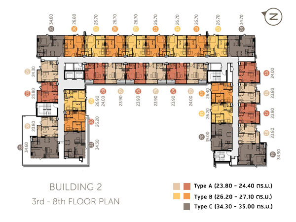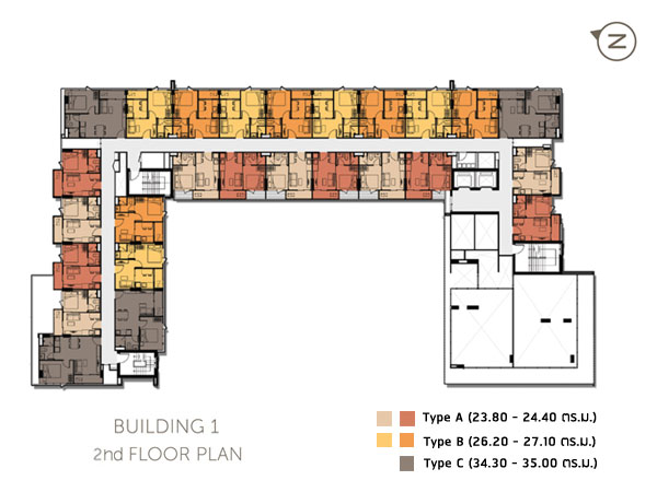 โดยแต่ละชั้นจะมีห้อง Type C ซึ่งเป็นห้องขนาดใหญ่เพียง 6 ยูนิต/ชั้น เท่านั้น (สีเทาเข้ม) ซึ่งอยู่มุมๆ