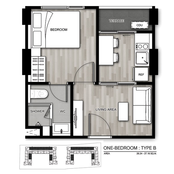 Layout ห้องแบบ 1 ห้องนอน Type B ขนาดพื้นที่ใช้สอย 27 ตร.ม.