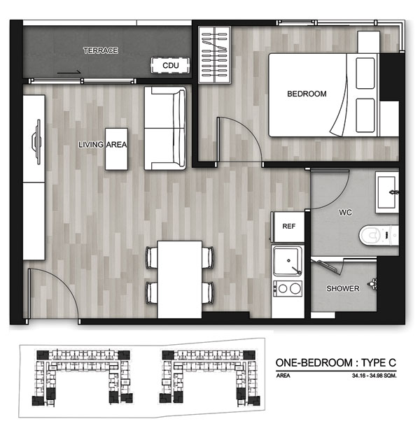 - ห้องพักอาศัย : แบบ 1 ห้องนอน แบ่งเป็น 3 Type ขนาด 23.80 - 35.00 ตร.ม.