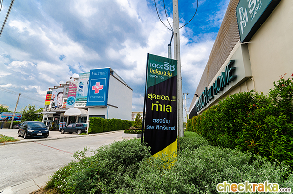 พื้นที่บริเวณรอบๆ โครงการส่วนใหญ่จะเป็นร้านค้า ร้านอาหารค่ะ อาหารการกินเรียกได้ว่าอุดมสมบูรณ์มาก เดินมาซื้อได้เลยไม่จำเป็นต้องใช้รถค่ะ ส่วนความสูงรอบๆ นั้นส่วนใหญ่จะเป็น 2- 3 ชั้น ยกเว้นซิตี้โฮมแต่ก็ไม่ได้อยู่ติดกันกับโครงการนะคะ ห่างออกไปพอสมควร ที่สำคัญอุ่นใจได้เพราะอยู่ใกล้กับโรงพยาบาลเลย เดี๋ยวเราเริ่มเดินจากโครงการไปดูกันค่ะ