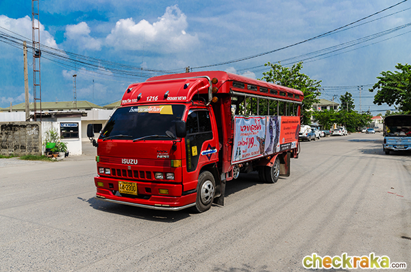 เมื่อลงรถไฟฟ้า BTS สถานีแบริ่ง ทางออกที่ 1 มาแล้ว ก็เดินเข้ามาในถนนลาซาลประมาณ 100 เมตร ขึ้นรถสองแถวคันใหญ่มาได้เลยค่ะ รถสายนี้วิ่งทั้งเส้นลาซาล ผ่านหน้าโครงการพอดี