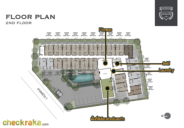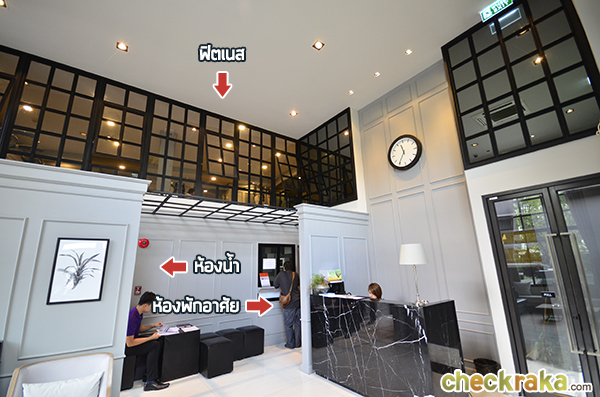 ชั้น 2 : มี Fitness ที่สามารถมองผ่านกระจกรับวิวหญ้าสีเขียวจากฝั่งตรงข้ามได้ และมีห้องที่เป็นที่ตั้งของเครื่องซัก