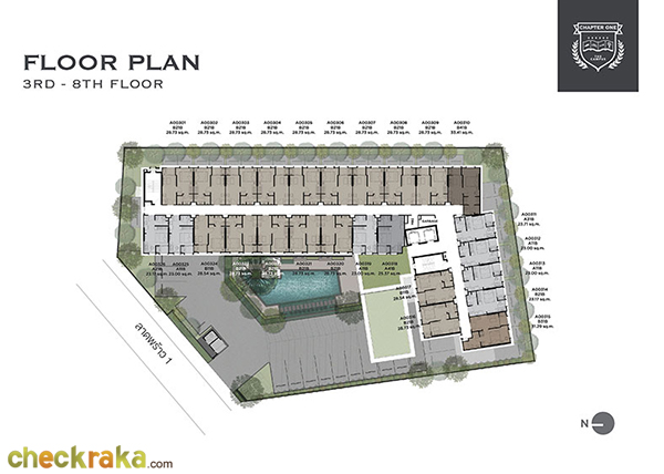 ชั้น 3-8 : เป็นชั้นพักอาศัยชั้นละ 26 ยูนิต แต่ขนาดพื้นที่ใช้สอยของแต่ละห้องอาจจะแตกต่างกันบ้างเล็กน้อย