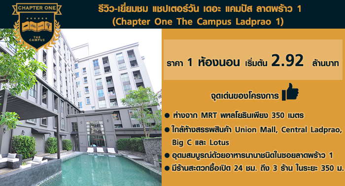สวัสดีค่ะ ใครที่กำลังมองหาคอนโดใจกลางเมือง อยู่ท่ามกลางแหล่งชอปปิ้ง คิดถูกแล้วล่ะค่ะที่คลิกเข้ามาดูรีวิวนี้ เพราะเรากำลังจะพาทุกท่านไปเยี่ยมชมโครงการ แชปเตอร์วัน เดอะ แคมปัส ลาดพร้าว 1 (Chapter One The Campus Ladprao 1) คอนโดมิเนียมแต่งครบสไตล์ Soft Loft ใกล้ MRT สถานีพหลโยธินเพียง 350 เมตร ทำเลกลางเมืองลาดพร้าวซอย 1 เพียบพร้อมด้วยสิ่งอำนวยความสะดวกมากมาย อาทิ ห้างยูเนี่ยน มอลล์ เซ็นทรัล พลาซา ลาดพร้าว Big C และ Tesco Lotus เราไปชมบรรยากาศจริงของโครงการกันเลยดีกว่าค่ะ