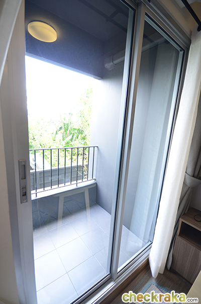 ระเบียงกว้างพอสมควร วางชุดโต๊ะเล็กๆ นั่งรับลมได้ หรือจะตากผ้าก็วางราวใหญ่ๆ ได้เลยค่ะ
