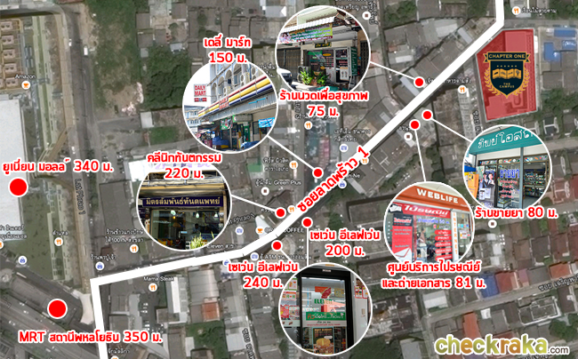 - ทำเลรอบโครงการ - บริเวณแยกลาดพร้าวเป็นย่านที่อุดมสมบูรณ์ไปด้วยร้านอาหารมากมาย โดยเฉพาะร้านรถเข็นข้างทางจะมีเยอะมากๆ ค่ะ เพราะใกล้กับห้างสรรพสินค้า ป้ายรถเมล์ที่เป็นจุดรวมของคน และเข้าไปในซอยลาดพร้าว 1 ก็ยิ่งอุดมสมบูรณ์ขึ้นไปอีกเพราะมีของขายเยอะมากค่ะ มีอาหารทุกภาค ทุกรูปแบบ ผลไม้ ขนม พร้อมมีร้านสะดวกซื้อที่เปิด 24 ชั่วโมงเปิดถึง 3 ร้าน ในระยะ 350 เมตรจากปากซอยเท่านั้น หรือถ้าใครอยากได้แอร์เย็นๆ ก็เดินไปยูเนี่ยน มอลล์ เซ็นทรัล ลาดพร้าว ได้ค่ะ และยังมีบิ๊กซีและโลตัสที่อยู่ไม่ไกลอีกด้วย