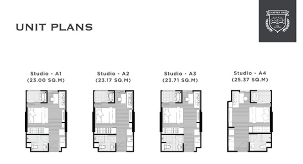 1. ห้องแบบสตูดิโอ ขนาด 23.00 - 25.37 ตร.ม. (คลิกเพื่อชมแปลนห้อง)