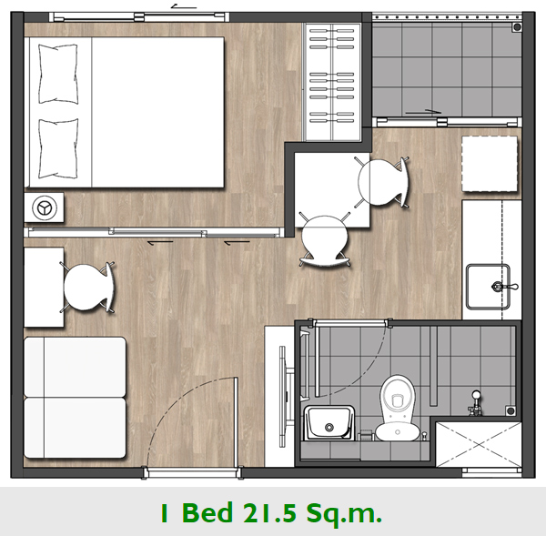 - ห้องแบบ 1 ห้องนอน (1 ห้องนอน, 1 ห้องน้ำ, 1 ห้องครัวเปิด) - เนื้อที่ 21.50 ตร.ม.
