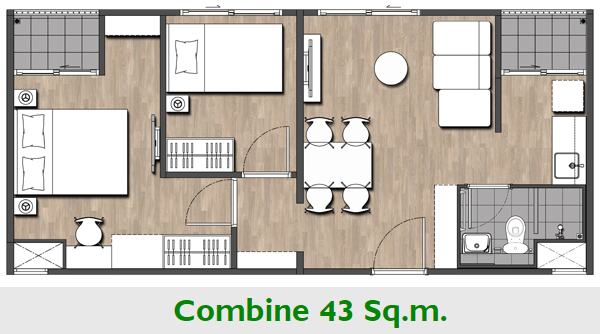 (คลิกเพื่อชมแปลนห้อง) - ห้องแบบ Combine (2 ห้องนอน, 1 ห้องน้ำ, 1 ห้องครัวเปิด) - เนื้อที่ 43.00 ตร.ม.
