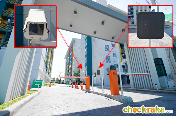 ตรงประตูเข้าออกโครงการ มีไม้กระดกกั้น พร้อมกล้อง CCTV และพี่ รปภ. ที่คอยช่วยดูแลความปลอดภัย