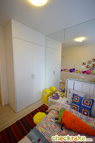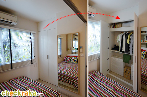 ด้านข้างของเตียงจะเป็นตำแหน่งของตู้เสื้อผ้า Built-in สีขาว ที่ทางโครงการให้มา