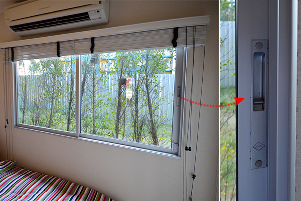หน้าต่างเป็นบานสไลด์แบบ 2 ตอน กรอบอลูมิเนียมสีธรรมชาติ ได้ตัวล็อกแบบนี้