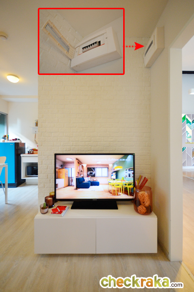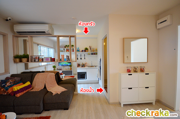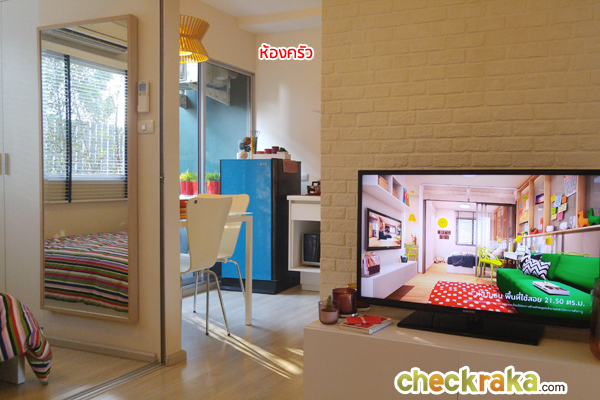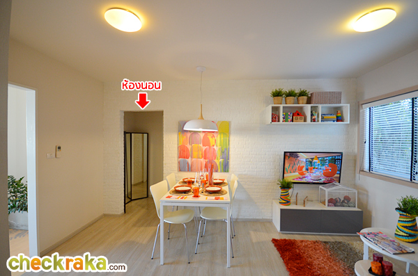เดินเข้าประตูมาด้านขวาจะเป็นชั้นวางทีวี ระยะดูทีวีห่างจากโซฟาประมาณ 2.4 เมตร