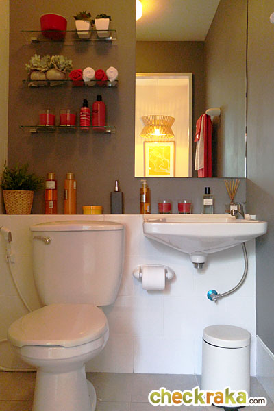 ได้กระเบื้องปูพื้น และผนังภายในในห้องน้ำสีเทาตามนี้ ยกเว้นชั้นวางของที่เป็นกระจก และของตกแต่งในห้องน้ำที่ไม่ได้