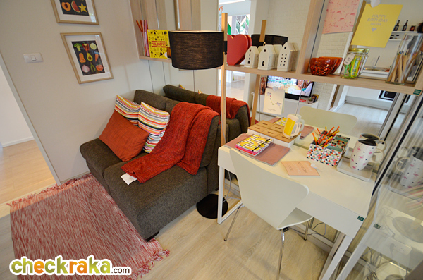 ด้านซ้ายมือของห้องสามารถวางโซฟาขนาด 2 ที่นั่ง และโต๊ะทำงาน