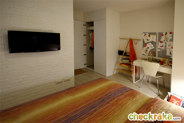ปลายเตียงมีพื้นที่จำกัด ไม่เหมาะกับการวางชั้นวางทีวี แต่หากอยากดูทีวีคงต้องแขวนผนังเอาแบบในภาพ