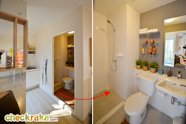 ภายในห้องน้ำแยกพื้นที่สำหรับส่วนเปียกและส่วนแห้ง ไม่มีฉากกั้นอาบน้ำ เว้นช่องไว้ด้านข้างของธรณี เพื่อเป็นทางให้น้ำไหลผ่านเนื่องจากมีตะแกรงน้ำทิ้ง (Floor drain) ตัวเดียว ปูกระเบื้องติดผนังเฉพาะที่เป็นส่วนเปียกเท่านั้น