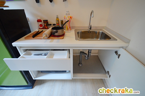 เปิดออกมาหน้าตาแบบนี้ค่ะ มีช่องเก็บของใต้อ่างล้างจาน และมีลิ้นชักสำหรับใส่อุปกรณ์ทำครัวชิ้นเล็กๆ