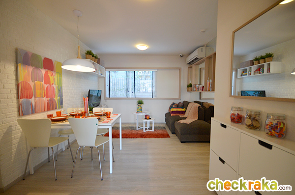 จากประตูเดินเข้ามาจะเจอกับโต๊ะทานอาหารขนาด 4 ที่นั่ง ตั้งอยู่ทางซ้ายมือ และถัดไปเป็นโซนนั่งเล่น