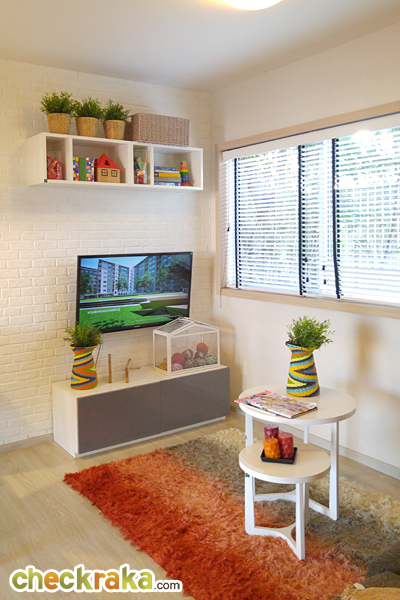 โต๊ะวางทีวี และโต๊ะทำงาน ได้วอลล์เปเปอร์สีขาวสำหรับส่วนนั่งเล่น และส่วนห้องนอน