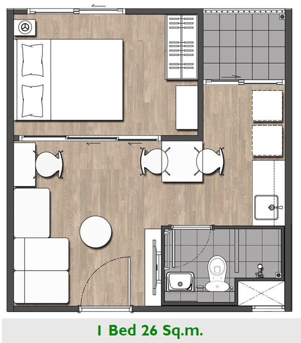 (คลิกเพื่อชมแปลนห้อง) - ห้องแบบ 1 ห้องนอน (1 ห้องนอน, 1 ห้องน้ำ, 1 ห้องครัวเปิด) - เนื้อที่ 26.00 ตร.ม.
