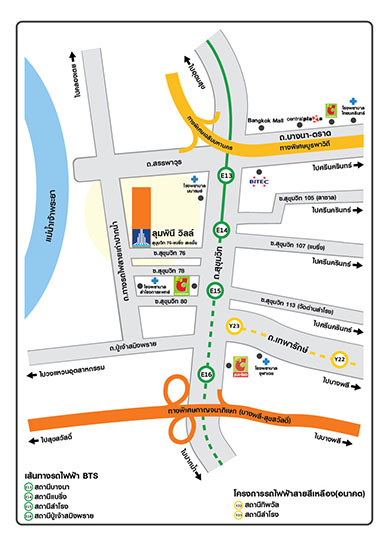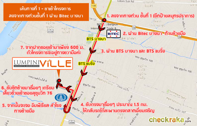 - การเดินทางเข้าออกโครงการ - หากเลือกใช้รถส่วนตัวโครงการนี้สามารถเลือกเส้นทางเข้า-ออกได้สองทาง ได้แก่ จากปากซอยสุขุมวิท 76 วิ่งเข้ามาถึงโครงการมีระยะทางประมาณ 600 เมตร และจากถนนรางรถไฟสายเก่าที่วิ่งมาทางถนนปู่เจ้าสมิงพรายมีระยะทางประมาณ 100 เมตรถึงตัวโครงการ สำหรับจุดขึ้นลงทางด่วน หากต้องการเลี่ยงรถติดในช่วงเวลาเร่งรีบให้เลือกวิ่งด้านหลังโครงการเข้าถนนรางรถไฟสายเก่า ตรงไปจนกว่าจะเจอแยกสรรพาวุธ เลี้ยวขวาเข้าถนนสรรพาวุธ ใช้เวลาเพียง 10 นาทีก็ถึงทางพิเศษเฉลิมมหานครแล้วค่ะ หรือจะเลือกใช้บริการขนส่งมวลชนเป็นอีกหนึ่งทางเลือกที่ให้ความสะดวกไม่แพ้กันสถานีที่ใกล้ที่สุดเป็นสถานีแบริ่ง มีระยะทางถึงตัวโครงการประมาณ 1.5 กม. เท่านั้น