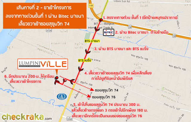 เส้นทางเข้าที่ 2 - ขาเข้าโครงการลงจากทางด่วนขั้นที่ 1 ผ่านไบเทค บางนา เลี้ยวขวาเข้าซอยสุขุมวิท 74