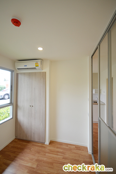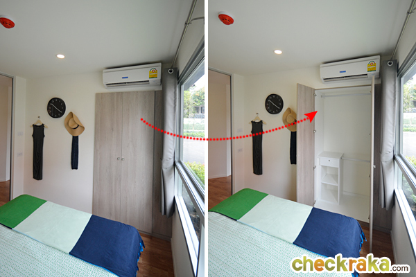 ภายในห้องนอนจะได้ตู้เสื้อผ้า Built-in ปิดผิวหน้า top เป็นลามิเนต บานพับแบบปกติ ตั้งอยู่บริเวณปลายเตียง