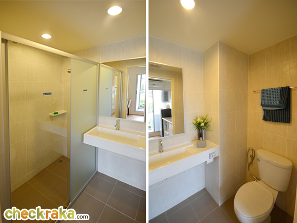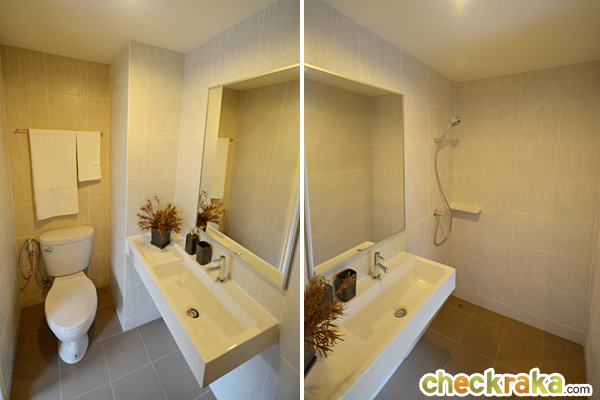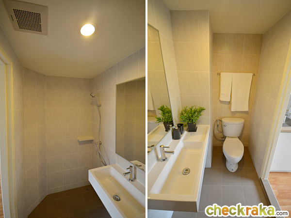 ภายในห้องน้ำจะแบ่งส่วนแห้งและส่วนเปียกออกจากกัน โดยโซนเปียกเป็นพื้นลดระดับเพื่อป้องกันน้ำขัง