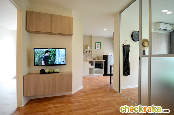 ด้านขวาของประตูทางเข้าห้องจะเป็นตำแหน่งของชั้นวางทีวี ทางโครงการติดตั้งปลั๊กไฟมาให้ด้วย