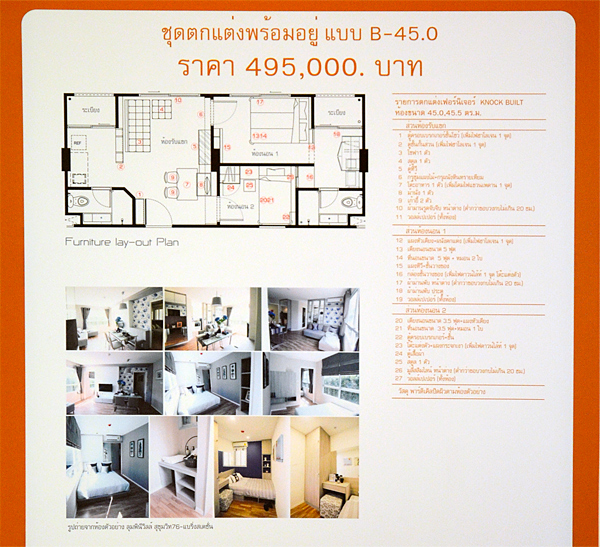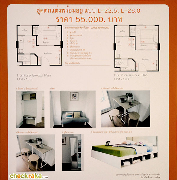 - ราคาเริ่มต้น 1.149 บาท สําหรับห้องขนาด 22.50 ตร.ม. (ข้อมูล ณ 28 ม.ค. 59)