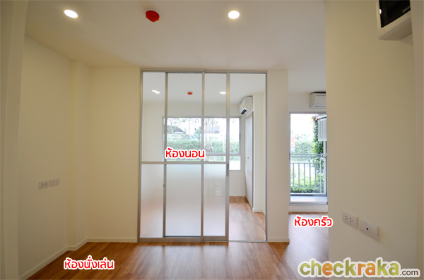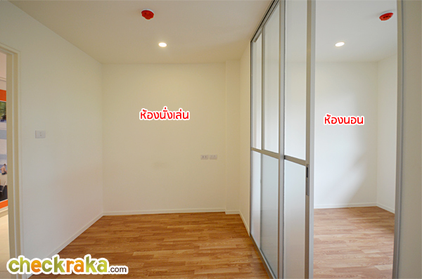เดินเข้ามาให้ห้องก็จะเป็นห้องนั่งเล่น ความสูงจากพื้นถึงฝ้าอยู่ที่ 2.40 เมตร พื้นห้องเป็นลามิเนตหนา 8 มม.