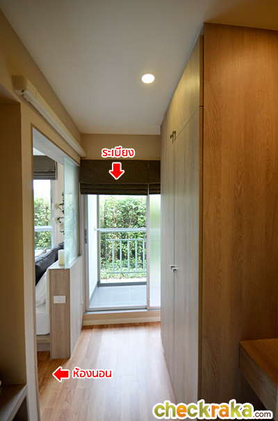 ในโซนนี้ตรงกลางจะเป็นตู้เสื้อผ้า Built-in แบบบานเปิดทรงสูง ส่วนด้านข้างจะเป็นระเบียง