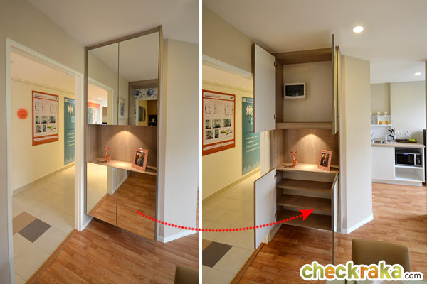 ฝั่งซ้ายที่ติดกับประตูจะเป็นตู้เก็บของ ซึ่งมีช่องเก็บของทั้งด้านบน และด้านล่าง