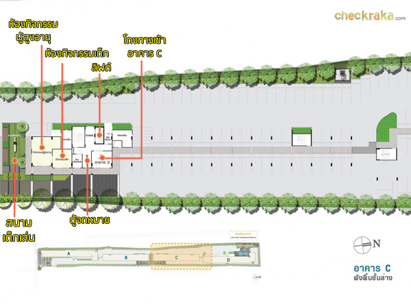 - ชั้นล่าง จะมีห้องกิจกรรมผู้สูงอายุ, ห้องกิจกรรมสำหรับเด็ก, พื้นที่จอดรถ และมีสนามเด็กเล่นตั้งอยู่ด้านนอกอาคาร พื้นที่ระหว่างอาคาร B กับอาคาร C