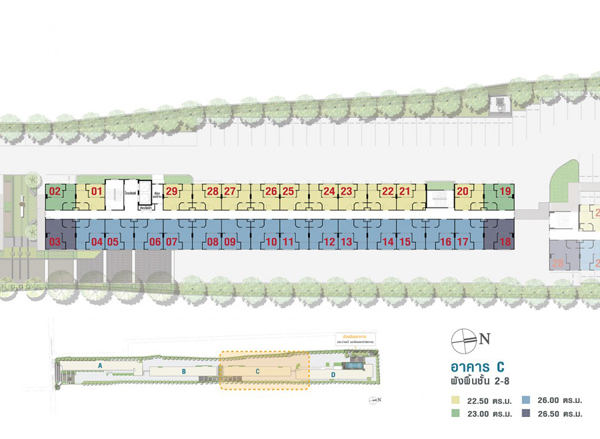 - ชั้น 2-8 เป็นส่วนพักอาศัยมียูนิตต่อชั้นอยู่ที่ 29 ยูนิต