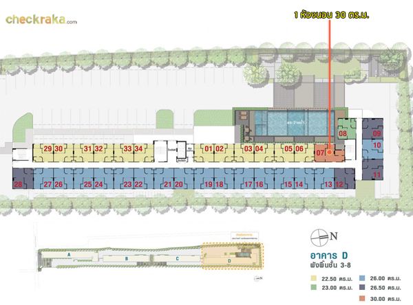 - ชั้น 3-8 เป็นส่วนพักอาศัยมียูนิตต่อชั้นอยู่ที่ 34 ยูนิต