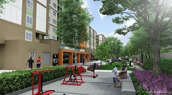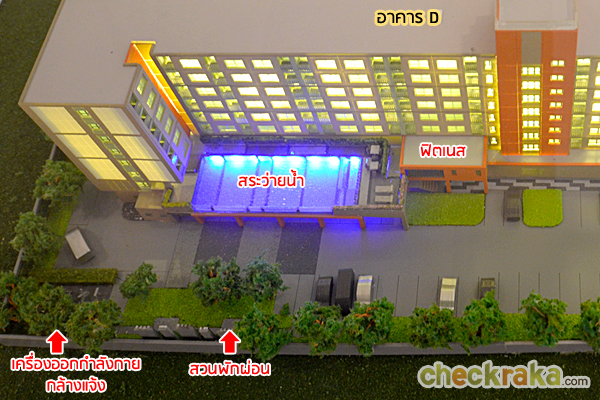โมเดลอาคาร D มุมมองจากทิศตะวันตก ชั้น 1 ทางโครงการจัดเป็นโซนสำหรับออกกำลังกายกลางแจ้ง พร้อมสวนพักผ่อน