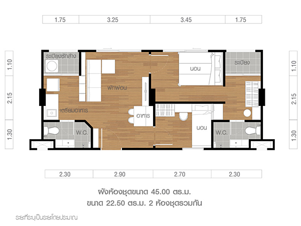 3) ห้องแบบ 2 ห้องนอน (Combine ขนาด 22.50 ตร.ม. 2 ห้องชุดรวมกัน) พื้นที่ใช้สอย 45.00 ตร.ม.