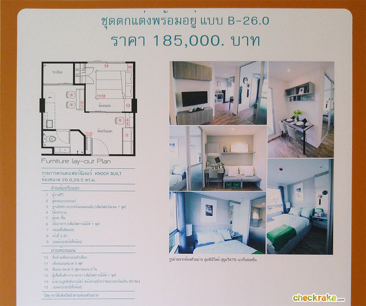 - ราคาเริ่มต้น 1.149 บาท สําหรับห้องขนาด 22.50 ตร.ม. (ข้อมูล ณ 28 ม.ค. 59)