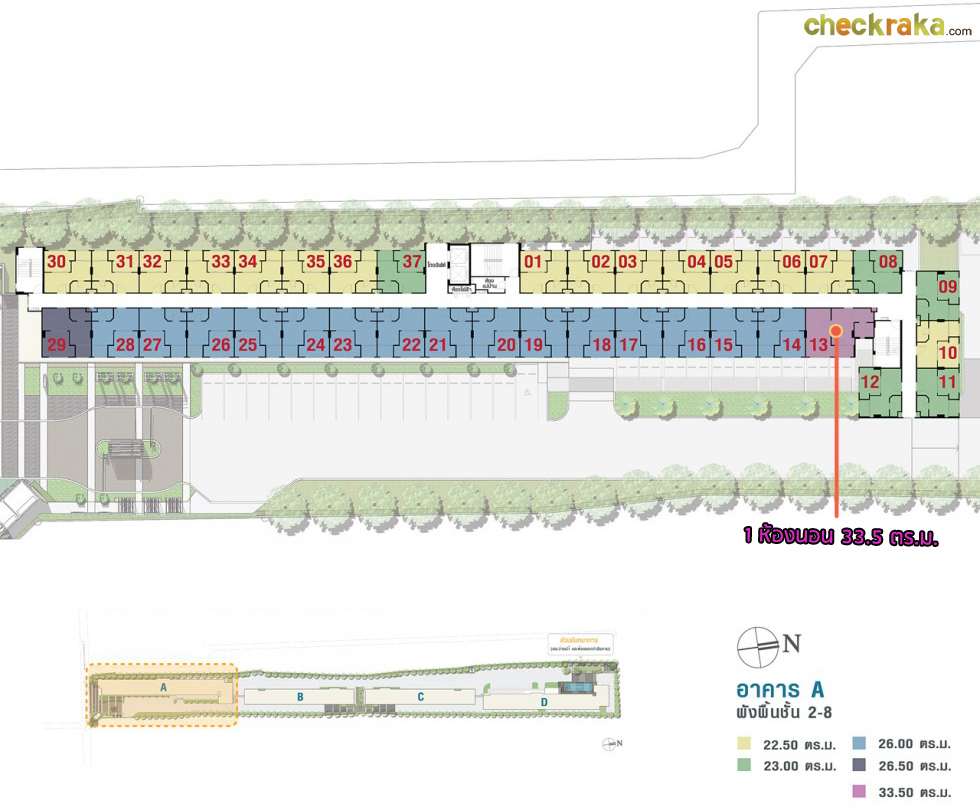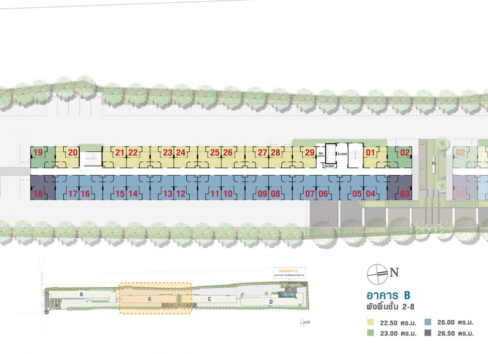 - ชั้น 2-8 เป็นส่วนพักอาศัยมียูนิตต่อชั้นอยู่ที่ 29 ยูนิต