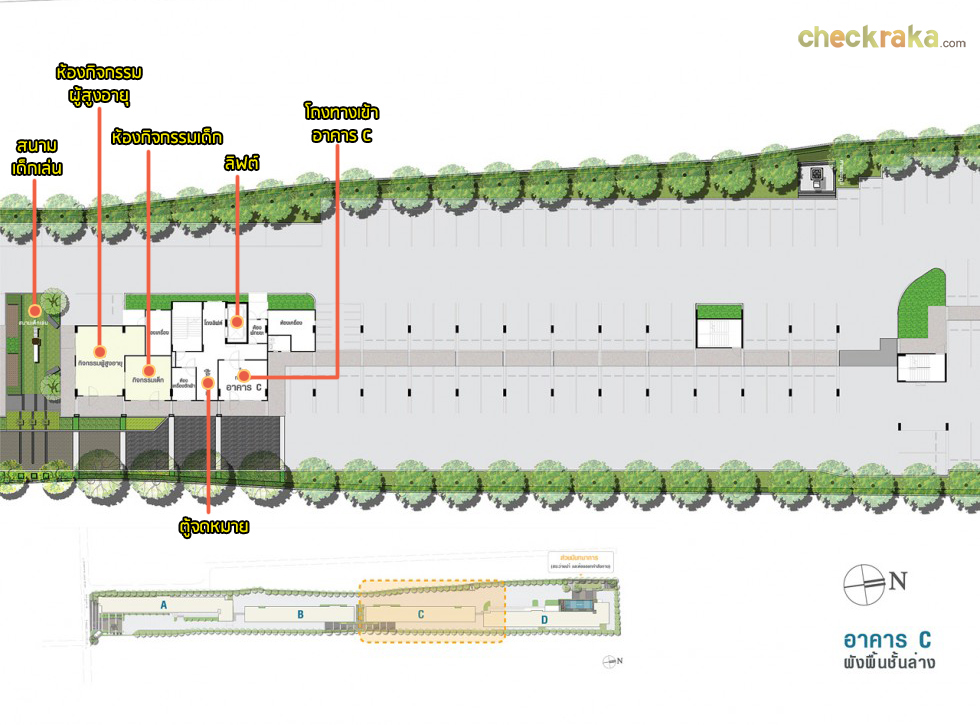 - ชั้นล่าง จะมีห้องกิจกรรมผู้สูงอายุ, ห้องกิจกรรมสำหรับเด็ก, พื้นที่จอดรถ และมีสนามเด็กเล่นตั้งอยู่ด้านนอกอาคาร พื้นที่ระหว่างอาคาร B กับอาคาร C