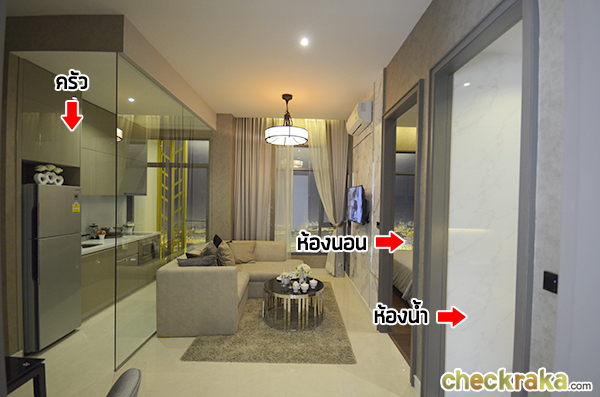 ซ้ายมือจะเป็นครัวแบบเปิดค่ะ ไม่ได้มีบานกระจกหรือผนังกั้นค่ะ