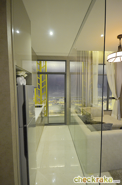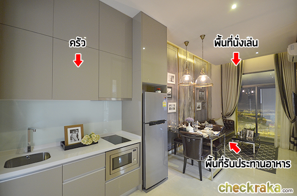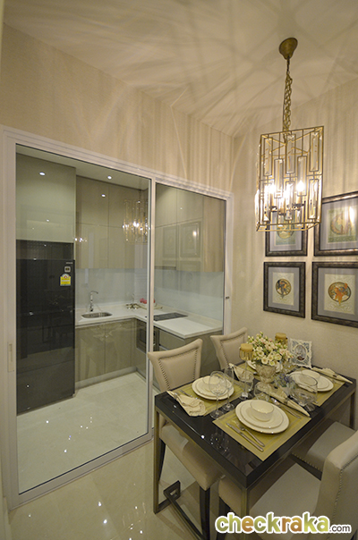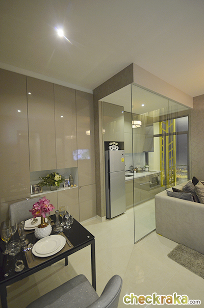 ทางเข้าครัวจริงๆ จะมีประตูกระจกกั้นให้ค่ะ ป้องกันกลิ่นรบกวนเข้าไปในห้องอื่นๆ